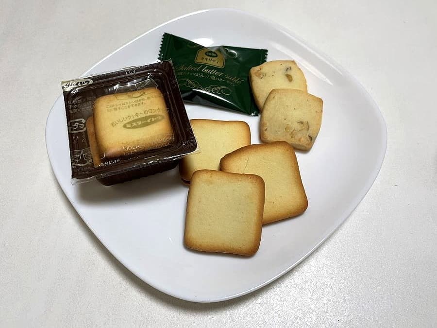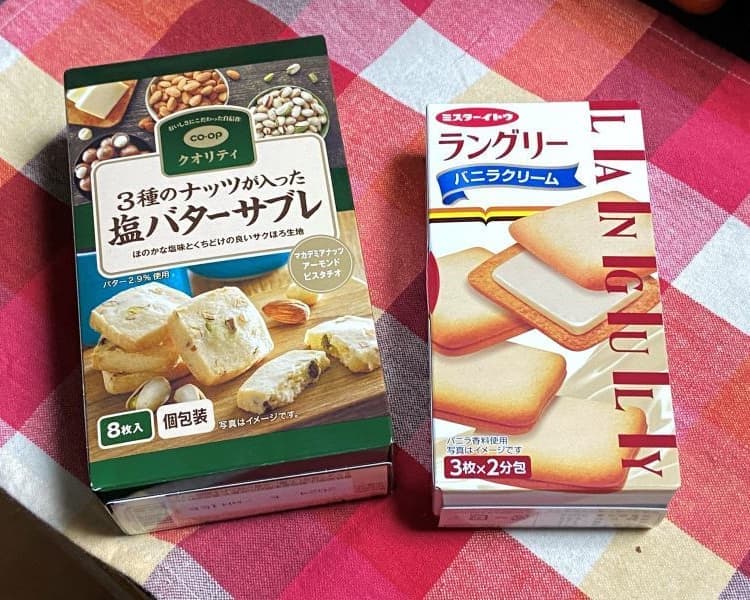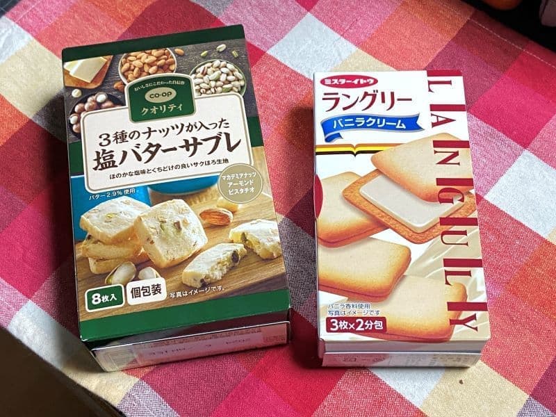 コープのプレミアムブランド「コープクオリティ」で「3種のナッツが入った 塩バターサブレ」、右のラングリー(バニラクリーム)は百均(ワッツ)で、クオリティの高い税別百円商品です。